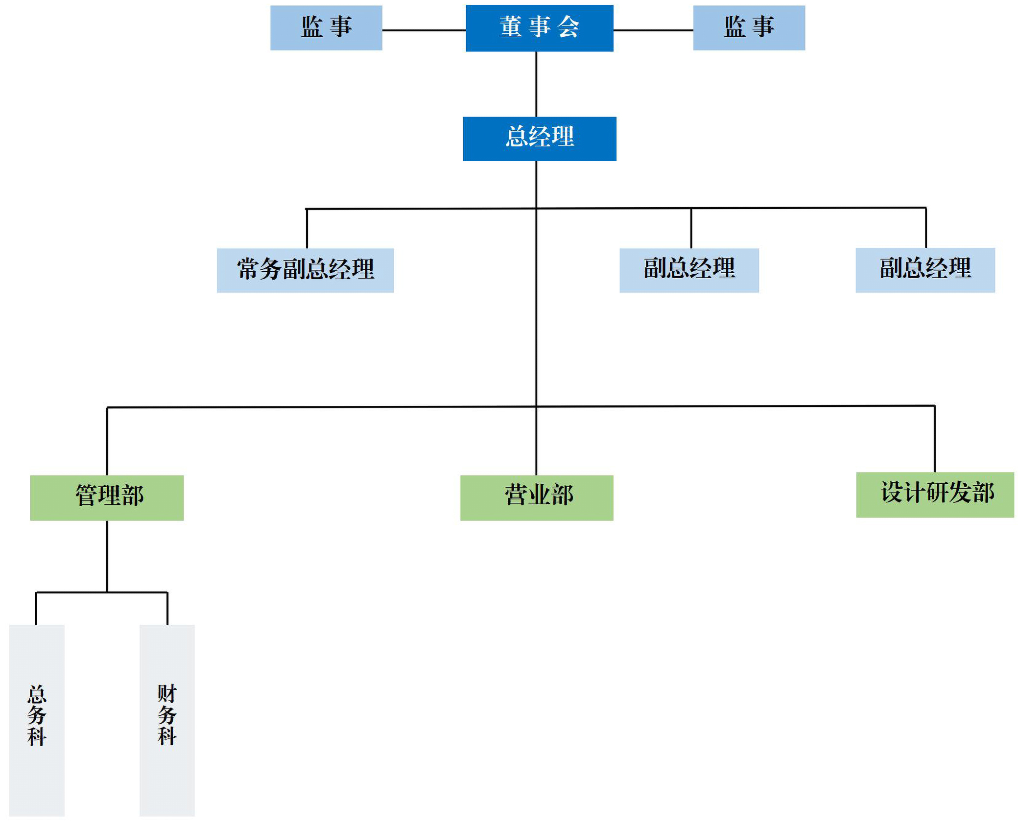 公司下設(shè):管理部、財務(wù)部、營業(yè)部、海外營業(yè)部、品質(zhì)部、采購部、工程部、設(shè)計部共8個部門。