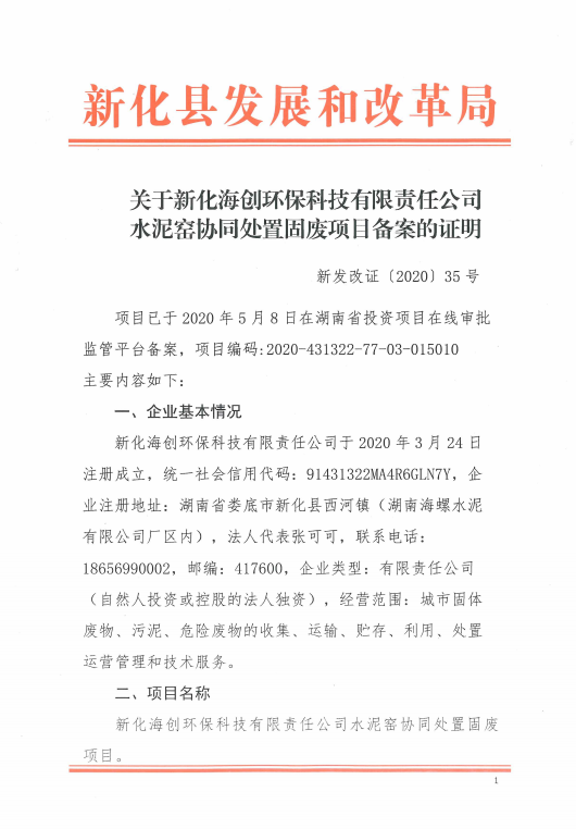 新化海創(chuàng)水泥窯協(xié)同處置固廢項目是新化縣2019年重點招商引資項目,項目于2019年12月23日簽署合作協(xié)議,計劃投資2.2億元,擬建設150t/d飛灰水洗水處理處置生產(chǎn)線和200t/d污泥處置系統(tǒng),年可處置飛灰4.95萬噸、污泥等一般固廢6.6萬噸。2020年3月24日公司注冊成立。自新化海創(chuàng)成立以來,在地方政府及母公司的大力支持和高度重視下,克服疫情影響、戰(zhàn)勝重重阻力,科學統(tǒng)籌、精準施策,加大對外協(xié)調(diào)力度,于5月9日取得核準備案批復,5月22日取得新化縣政府《關于同意項目開工建設的函》。項目從簽約到建設,僅歷時半年,建成后將與祁陽、臨湘、益陽等項目發(fā)揮協(xié)同效應。下一步,新化海創(chuàng)將盡快完成項目環(huán)評工作,穩(wěn)步推進權證辦理,盡早啟動工程建設,以只爭朝夕、奮發(fā)有為的姿態(tài),確保實現(xiàn)項目早竣工、早投產(chǎn)、早受益,助力地方政府打造"無廢城市",推動縣域經(jīng)濟綠色生態(tài)高質(zhì)量發(fā)展和人居環(huán)境的改善作出貢獻,為海螺創(chuàng)業(yè)的發(fā)展壯大添磚加瓦。