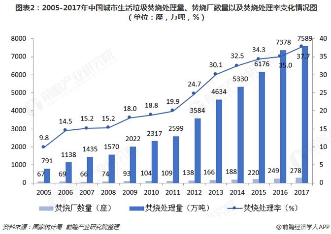 ? ? 和傳統(tǒng)的堆肥、填埋等處理方式相比,焚燒具有處理效率高、占地面積小、對環(huán)境影響相對較小等優(yōu)點,更能滿足城市生活垃圾處理對減量化和無害化的要求。并且焚燒處理的方式還能利用焚燒產(chǎn)生的熱能,實現(xiàn)垃圾的資源化,這些優(yōu)勢使得垃圾焚燒處理在近些年逐漸得到了較為廣泛的應(yīng)用與推廣。焚燒垃圾場的數(shù)量從2005年的67座增長到2017年的278座,焚燒垃圾處理量由2005年的791萬噸增長到2017年的7589萬噸。焚燒處理率由2005年的9.8%上升到2017年的37.7%。