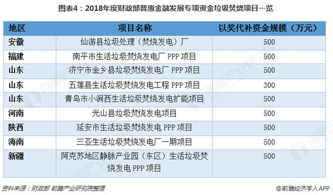 ? ? 2018年10月12日,財政部發(fā)布《關(guān)于下達2018年度普惠金融發(fā)展專項資金預(yù)算的通知》,并隨文公布了獲得PPP項目以獎代補資金項目名單,其中新建項目383個,存量項目11個。涉及大批流域綜合治理、污水處理廠、生活垃圾焚燒發(fā)電,環(huán)衛(wèi)等環(huán)保領(lǐng)域項目。其中涉及生活垃圾處理的項目有20個,包含9個垃圾焚燒項目。
