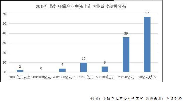 ? ? 在對截至4月30日已披露2018年營收數(shù)據(jù)的節(jié)能環(huán)保產(chǎn)業(yè)中資上市企業(yè)不同營收規(guī)模的企業(yè)數(shù)量情況進行分析的過程中,報告發(fā)現(xiàn),在節(jié)能環(huán)保產(chǎn)業(yè)中資上市企業(yè)中,營收規(guī)模在1000億元以上的有2家,營收規(guī)模在500億元~1000億元之間的企業(yè)數(shù)量為0,多數(shù)企業(yè)營收規(guī)模都在50億元以下。說明我國節(jié)能環(huán)保產(chǎn)業(yè)企業(yè)業(yè)務(wù)規(guī)模普遍較小,行業(yè)集中度不高。