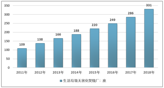 2011-2018年中國(guó)生活垃圾無(wú)害焚燒廠數(shù)量規(guī)模