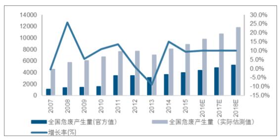 ? ? 2015年全國(guó)危廢產(chǎn)生量為3976萬(wàn)噸,但是由于該數(shù)據(jù)來(lái)源于企業(yè)自主申報(bào),明顯低于實(shí)際產(chǎn)生量。2007年危廢的產(chǎn)生量為4574萬(wàn)噸,大幅高于當(dāng)年《統(tǒng)計(jì)年報(bào)》所統(tǒng)計(jì)的數(shù)字1079萬(wàn)噸。污染源普查公告的數(shù)字接近真實(shí)值,其與企業(yè)自主申報(bào)值得比值為4.24。由于2011年危廢申報(bào)下限由10kg下降至1kg,危廢當(dāng)年的自主申報(bào)產(chǎn)生量大幅上升至3431萬(wàn)噸,假設(shè)當(dāng)年實(shí)際危廢增長(zhǎng)率與前三年復(fù)合增長(zhǎng)率相同,則當(dāng)年實(shí)際估測(cè)危廢產(chǎn)量為7651萬(wàn)噸,實(shí)際估測(cè)值與申報(bào)值之間比值下降為2.23,進(jìn)一步假設(shè)此后該比例都相同,則預(yù)測(cè)2018年全國(guó)危廢的實(shí)際產(chǎn)量在1.18億噸。而行業(yè)內(nèi)一般認(rèn)為實(shí)際危廢產(chǎn)量在一億噸左右。