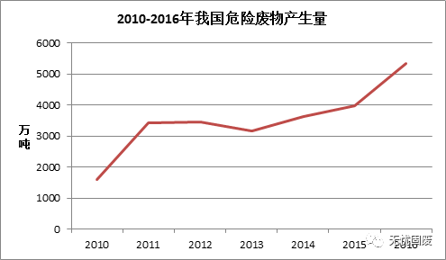 ? ? 工業(yè)行業(yè)是我國危險廢物的主要來源,根據(jù)2017中國統(tǒng)計年鑒顯示,2016年全國工業(yè)危險廢物產(chǎn)生量為5347.3萬噸,同比增長34.49%。