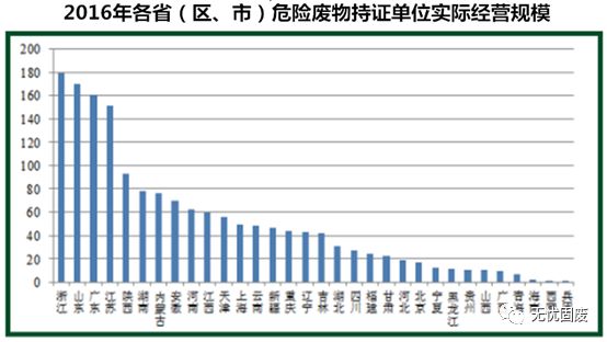 ? ? 截至2016年,全國危險廢物經(jīng)營持證單位共2195家,核準(zhǔn)經(jīng)營規(guī)模達(dá)到6471萬噸,平均每家約2.9萬噸。但實際經(jīng)營規(guī)模為1629萬噸,平均每家不足0.75萬噸。實際經(jīng)營規(guī)模排在前三位的分別是浙江、山東和廣東。