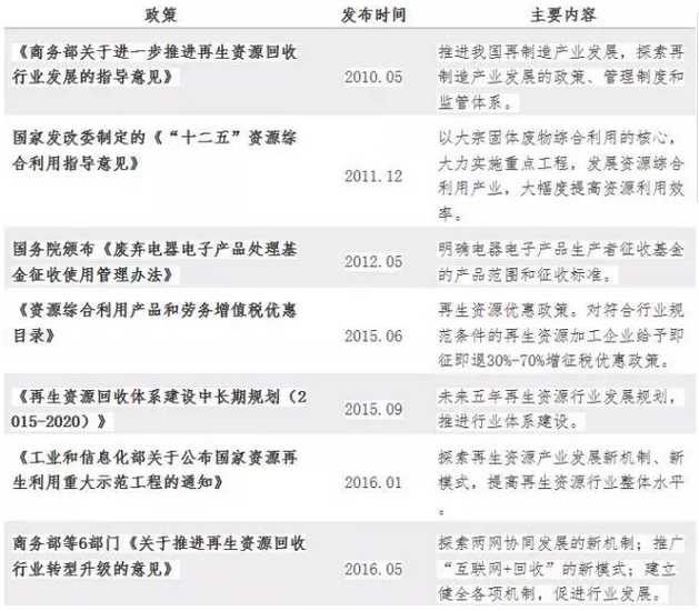 ? ? 2015年7月,國(guó)務(wù)院發(fā)布《國(guó)務(wù)院關(guān)于積極推進(jìn)“互聯(lián)網(wǎng) ”行動(dòng)的指導(dǎo)意見》,引導(dǎo)再生資源回收行業(yè)向信息化、自動(dòng)化、智能化方向發(fā)展,促進(jìn)再生資源交易透明化、便利化。2016年5月,商務(wù)部等國(guó)家六部委印發(fā)了《關(guān)于推進(jìn)再生資源回收行業(yè)轉(zhuǎn)型升級(jí)的意見》。強(qiáng)調(diào)推廣“互聯(lián)網(wǎng) 回收”的新模式;建立完善各項(xiàng)機(jī)制,促進(jìn)行業(yè)發(fā)展。