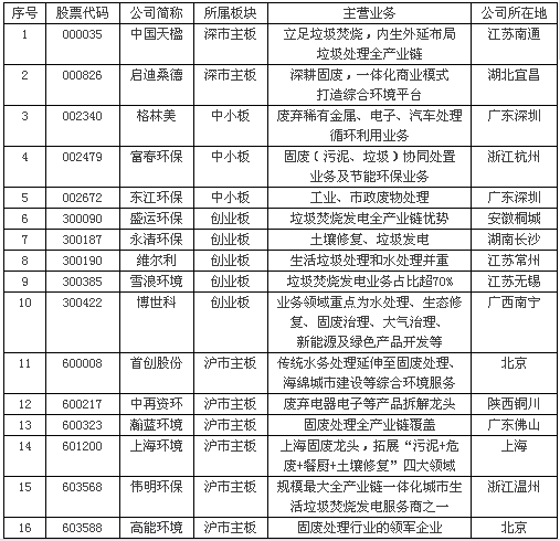 ? ? 在環(huán)保各子行業(yè)中,固廢處理行業(yè)具有投入大、周期長、回報穩(wěn)定的特點。本人對A股16家固廢處理行業(yè)上市公司進行了整理,具體公司情況如下表: