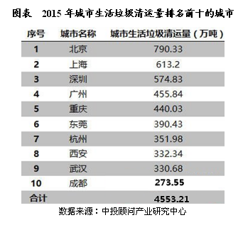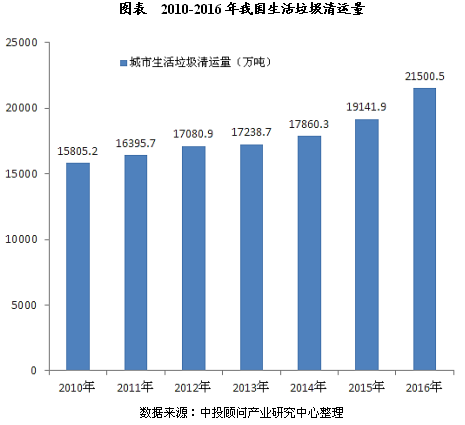 ? ? 中投顧問發(fā)布的《2018-2022年中國生活垃圾處理行業(yè)深度調研及投資前景預測報告》數據顯示:2016全國生活垃圾清運量約為21500.5萬噸。