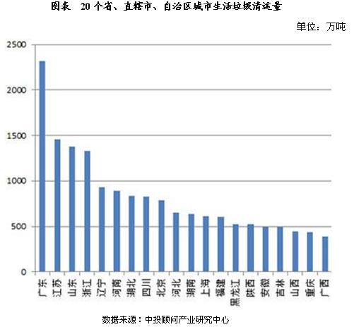 ? ? 廣東省、江蘇省、山東省的生活垃圾清運量位居全國前三位,分別達2320.4萬噸、1456.07萬噸和1377.49萬噸,而浙江省的垃圾清運量僅比山東省少45萬噸,而屈居第四位,其余27個省級行政區(qū)域垃圾清運量均未超過千萬噸大關。廣東、江蘇、山東、浙江四省的生活垃圾清運量達6486.62萬噸,占全國生活垃圾清運量的33.89%。