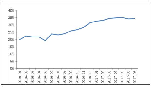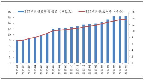 ? ? 根據(jù)全國PPP項目庫統(tǒng)計數(shù)據(jù),截至2017年7月末,全國入庫項目投資額高達(dá)16.54萬億元,同比大幅增長37.49%,共計13599個;項目落地率34.40%,比上月提升0.2個百分點。