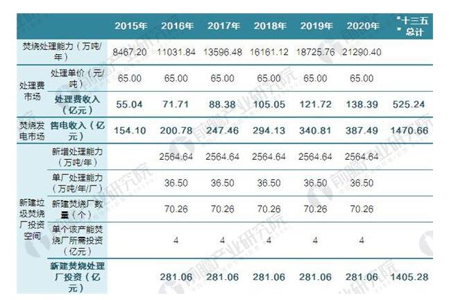 圖表5:“十三五”垃圾焚燒處理市場空間預(yù)測(單位:億元)