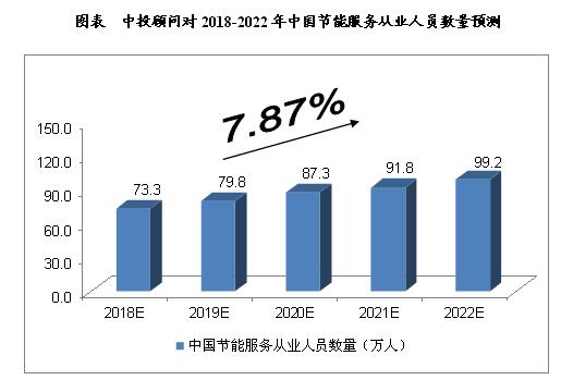 綜合以上因素,我們預(yù)計(jì),2018年我國節(jié)能服務(wù)從業(yè)人員數(shù)量將達(dá)到73.3萬人,未來五年(2018-2022)年均復(fù)合增長率約為7.87%,2022年將達(dá)到99.2萬人。