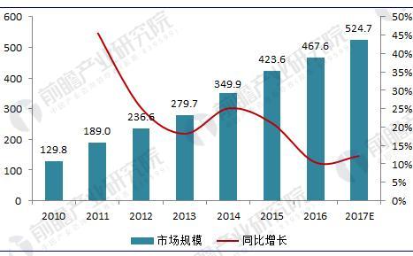 圖表2:2010-2017年我國(guó)污泥處理市場(chǎng)規(guī)模變化趨勢(shì)圖(單位:億元,%)